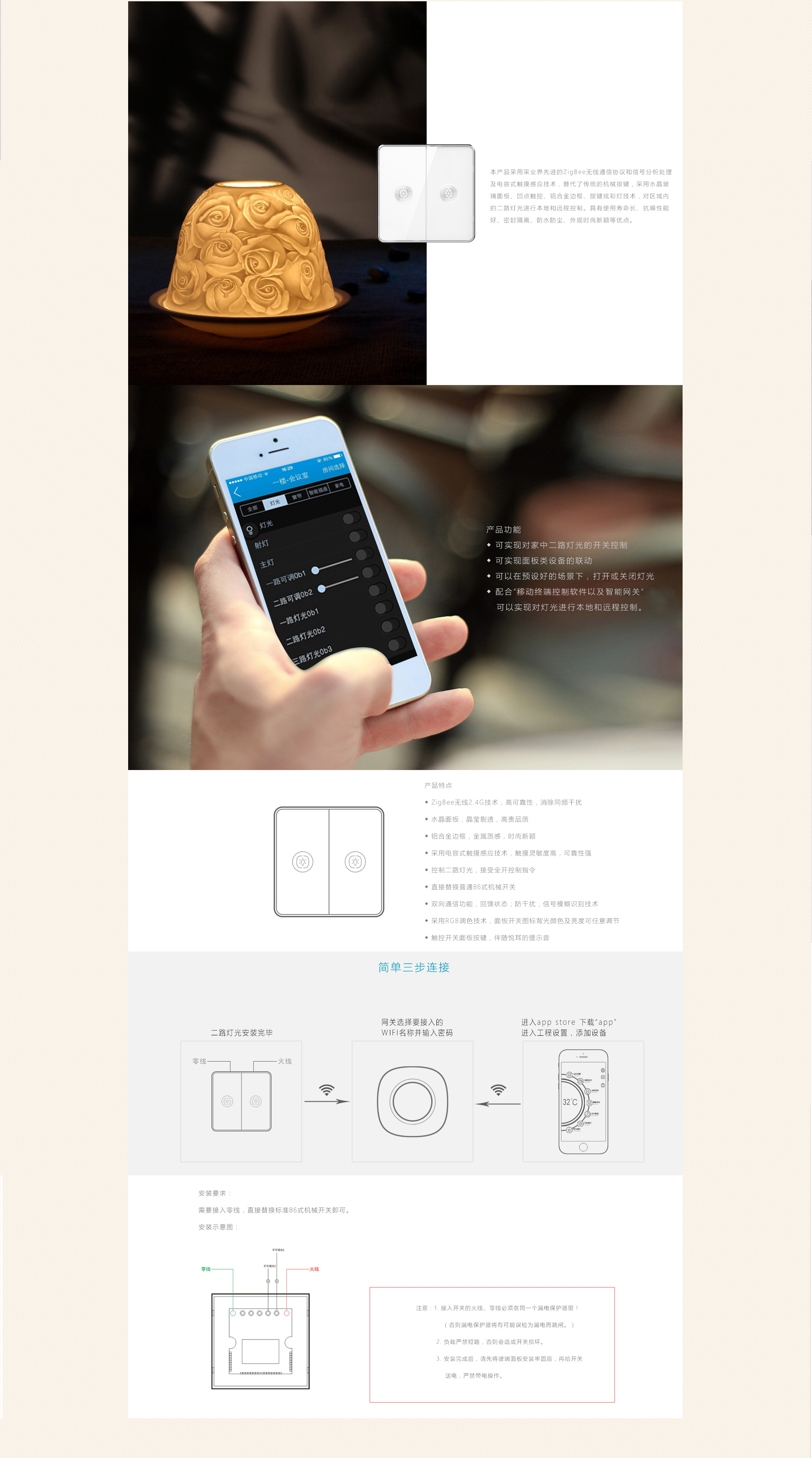 3. 安装完成后,请先将玻璃面板安装牢固后,再给开关送电,严禁带电操作。