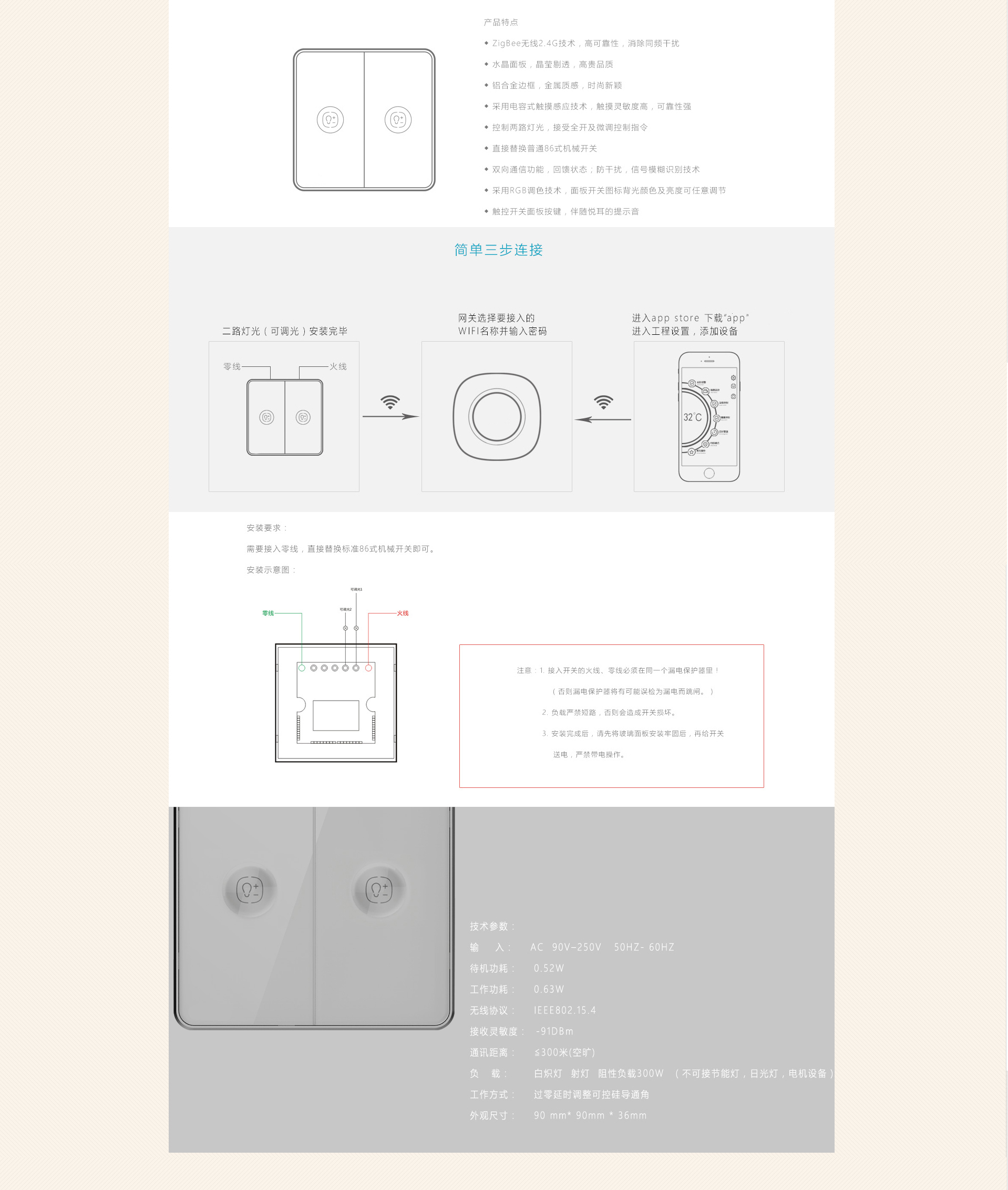 3. 安装完成后,请先将玻璃面板安装牢固后,再给开关送电,严禁带电操作。