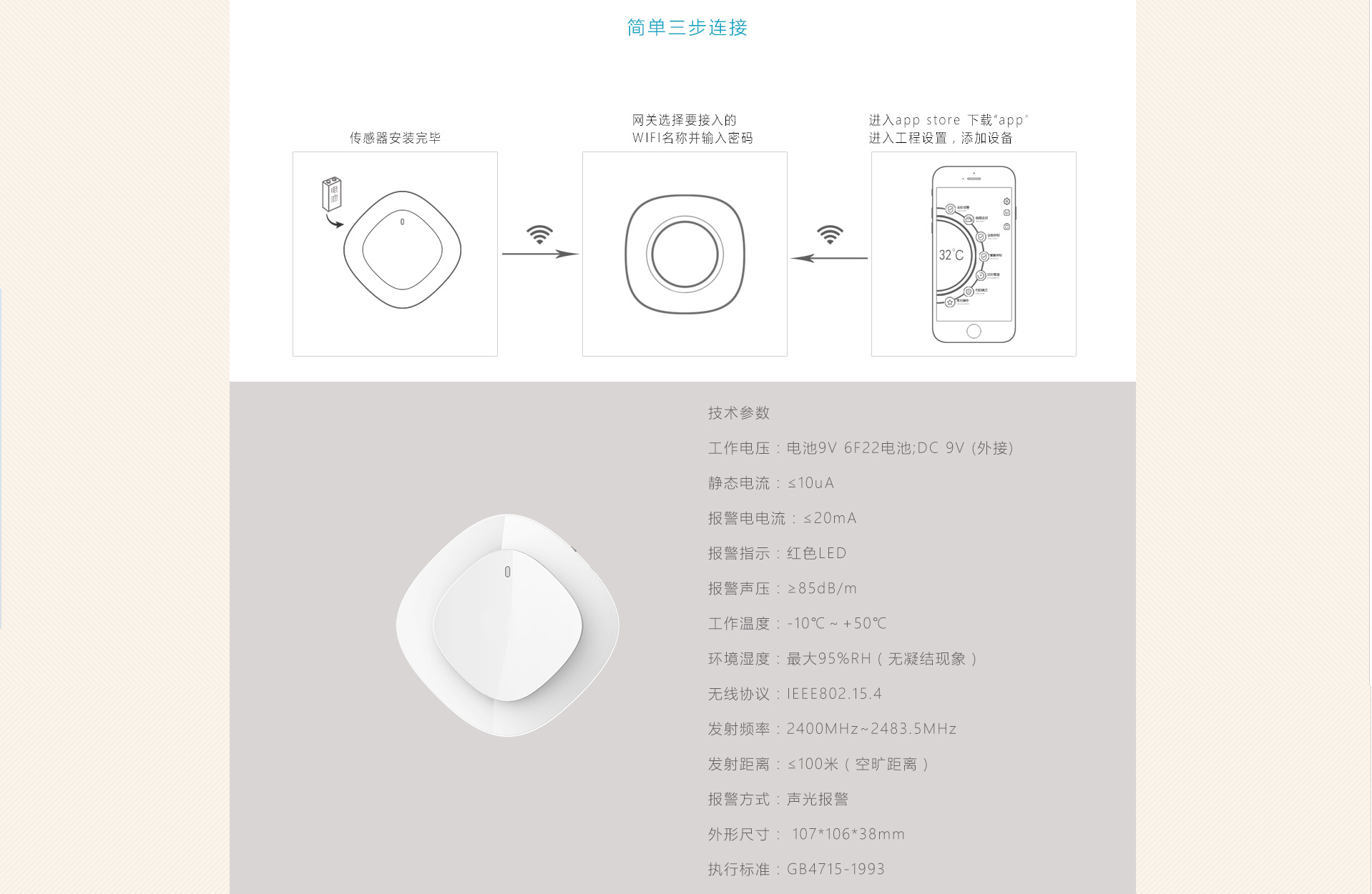 将电池安装于探测器的电池盒中,接通电源,报警指示灯闪亮一秒后,探测器进入自检状态,指示灯每20秒红色闪烁一次,报警状态时,指示灯每秒红色闪烁一次。产品安装完成后,按测试键测试产品是否正常工作,指示灯红灯闪烁,网关报警,可以将烟雾直接吹入探测器来测试产品性能是否正常。