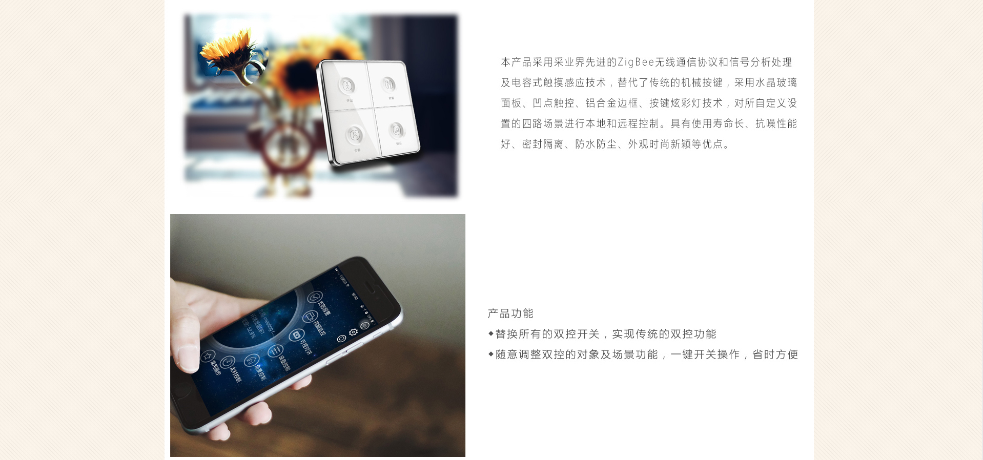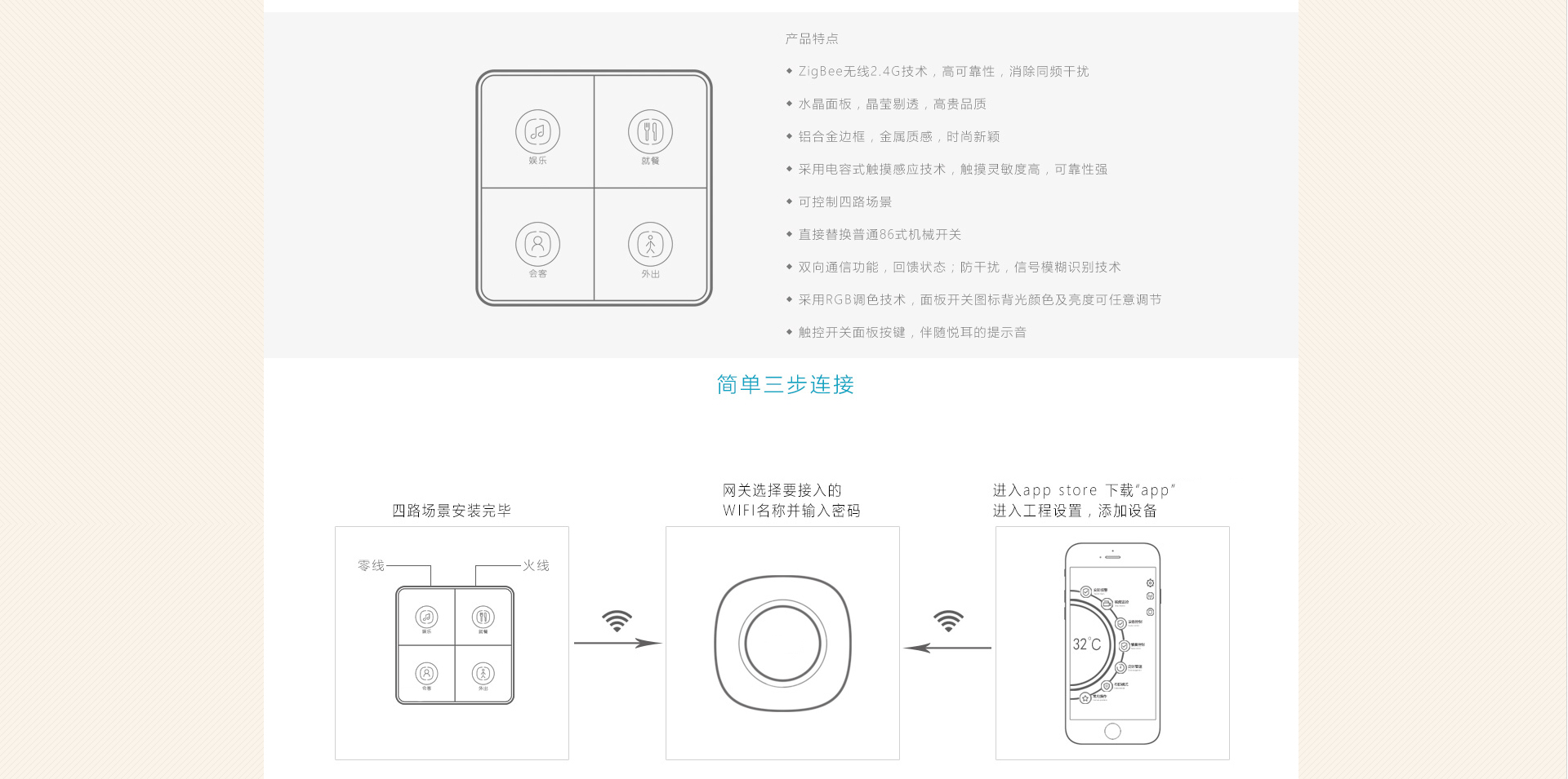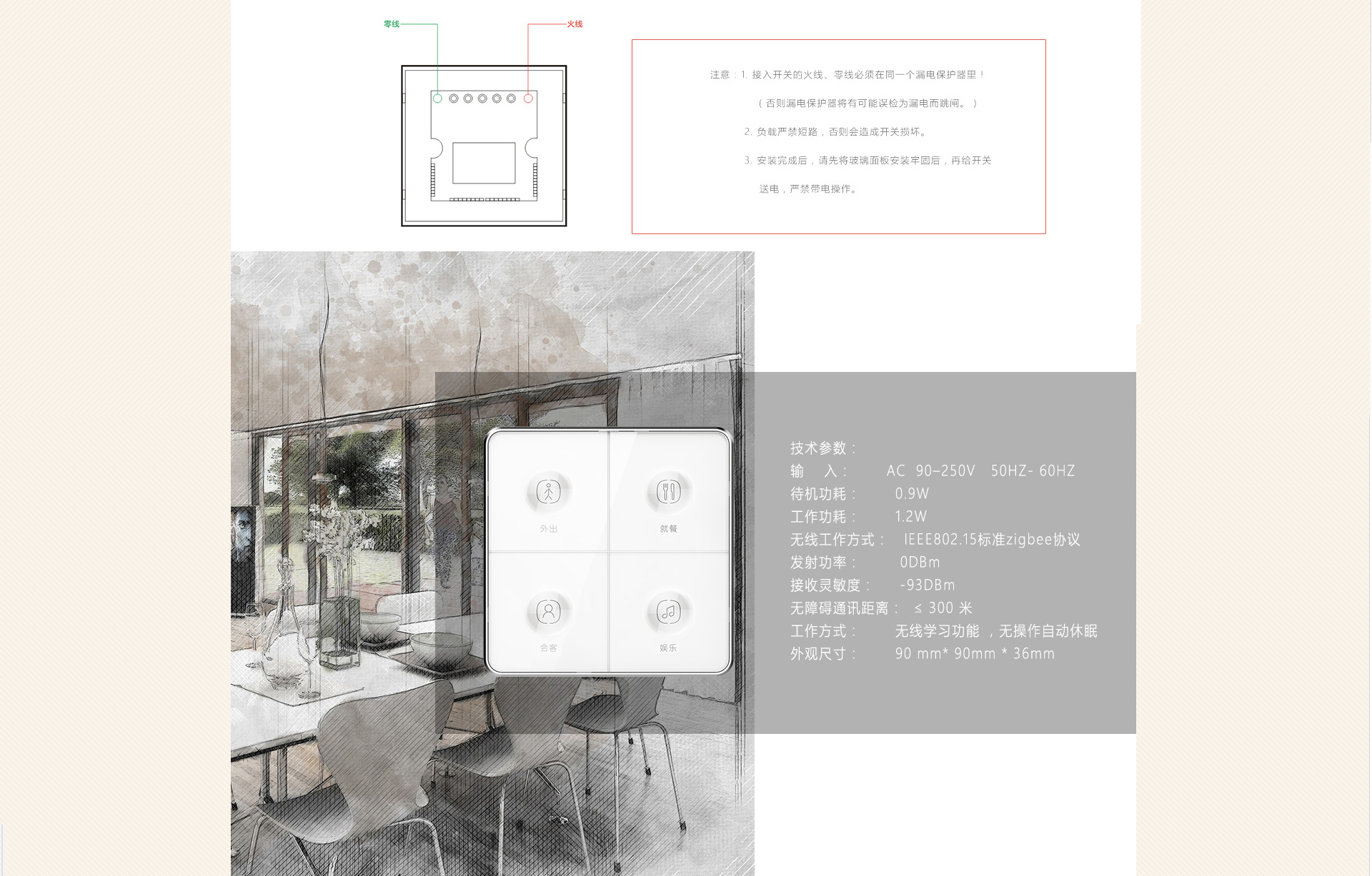 本产品采用采业界先进的ZigBee无线通信协议和信号分析处理及电容式触摸感应技术,替代了传统的机械按键,采用水晶玻璃面板、凹点触控、铝合金边框、按键炫彩灯技术,对所自定义设置的四路场景进行本地和远程控制。具有使用寿命长、抗噪性能好、密封隔离、防水防尘、外观时尚新颖等优点。