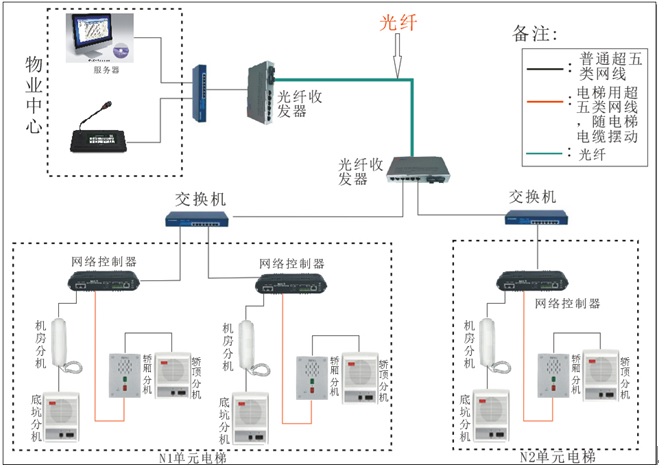 Ø 系统内,控制室分机、轿顶、轿厢、脚底各分机与数字ip电梯对讲联网控制器相连,实现与管理中心的语音视频通话,并录音录像;