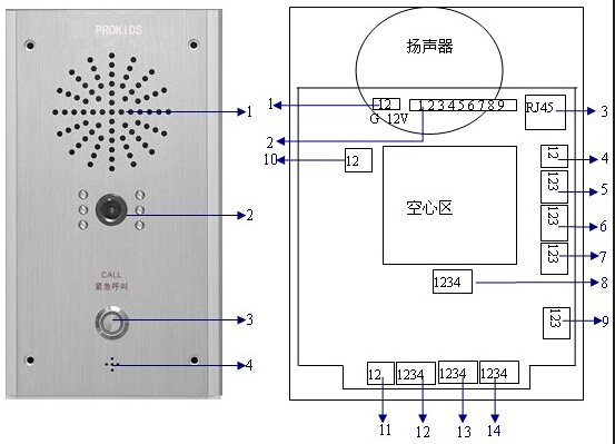 | 12 | 按键接口 | 对应于中心软件上“面板设置”中的呼叫地址项,4针接口。 |