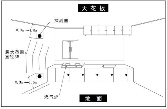 探测器比空气重的气体时:安装于高出地面0.3-1.0米,距气源半径1.5米内;探测比空气轻的气体时:安装于低于天花板0.3-1.0米,距气源1.5米内,如下图。