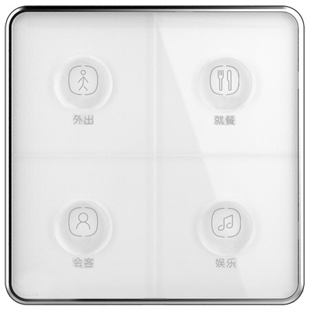 本产品采用ZigBee无线通信协议和信号分析处理及电容式触摸感应技术,替代了传统的机械按键,采用水晶玻璃面板、凹点触控、铝合金边框、按键炫彩灯技术,对所自定义设置的四路场景进行本地和远程控制。具有使用寿命长、抗噪性能好、密封隔离、防水防尘、外观时尚新颖等优点。